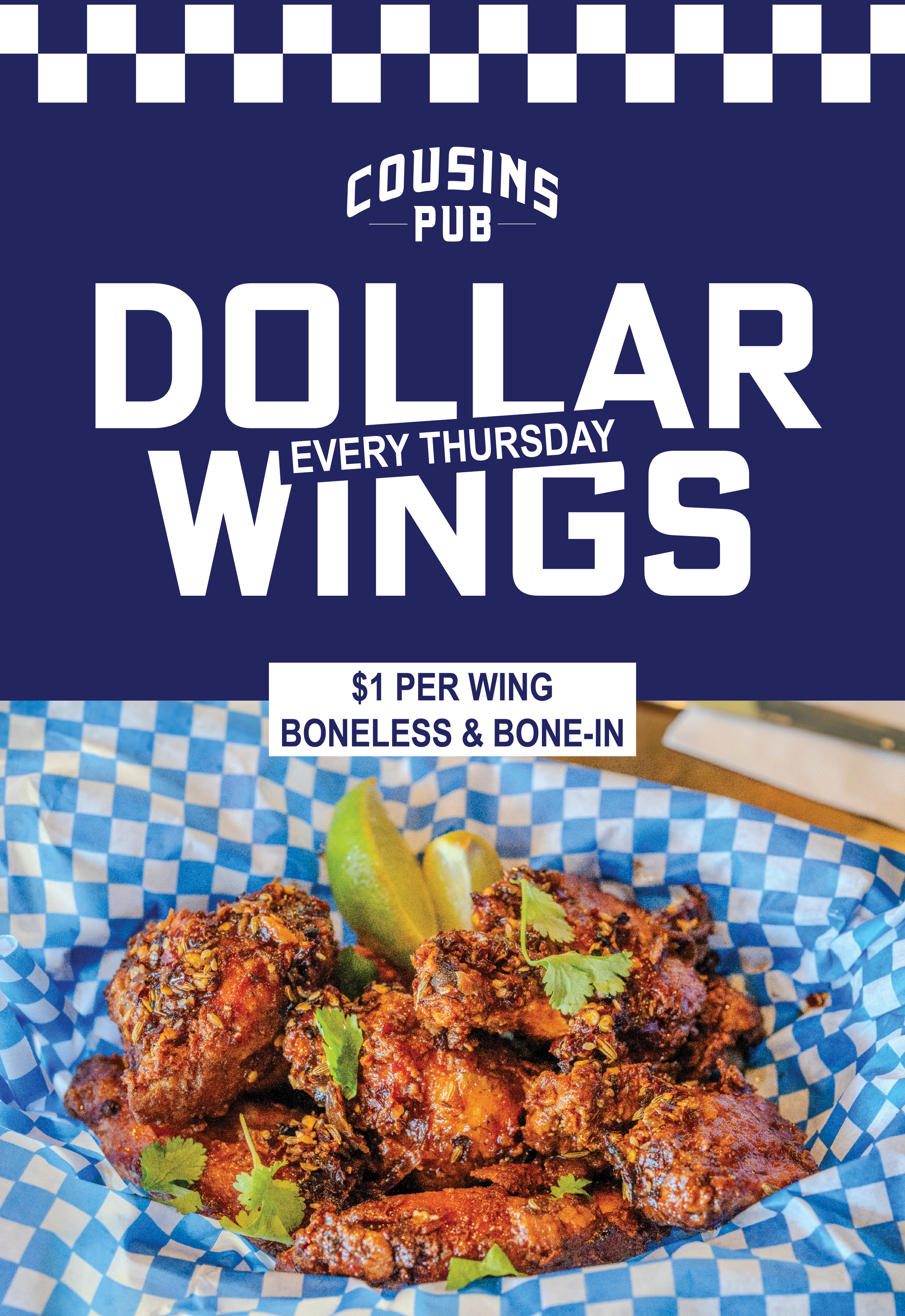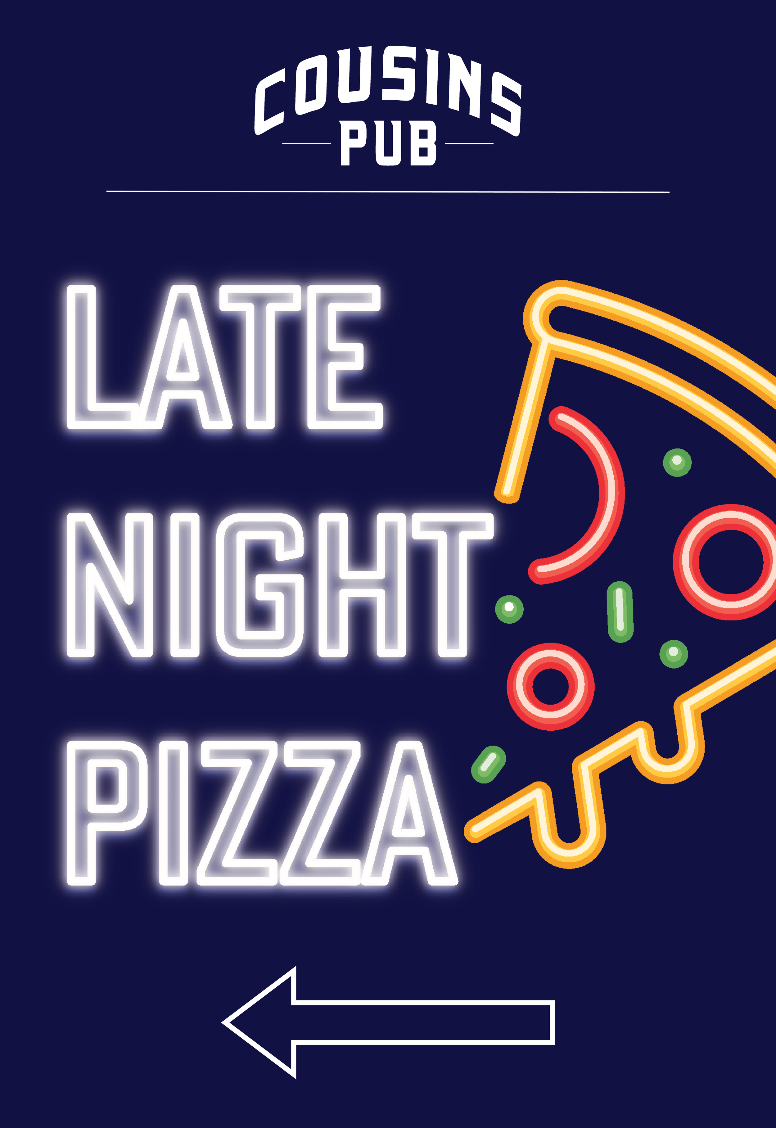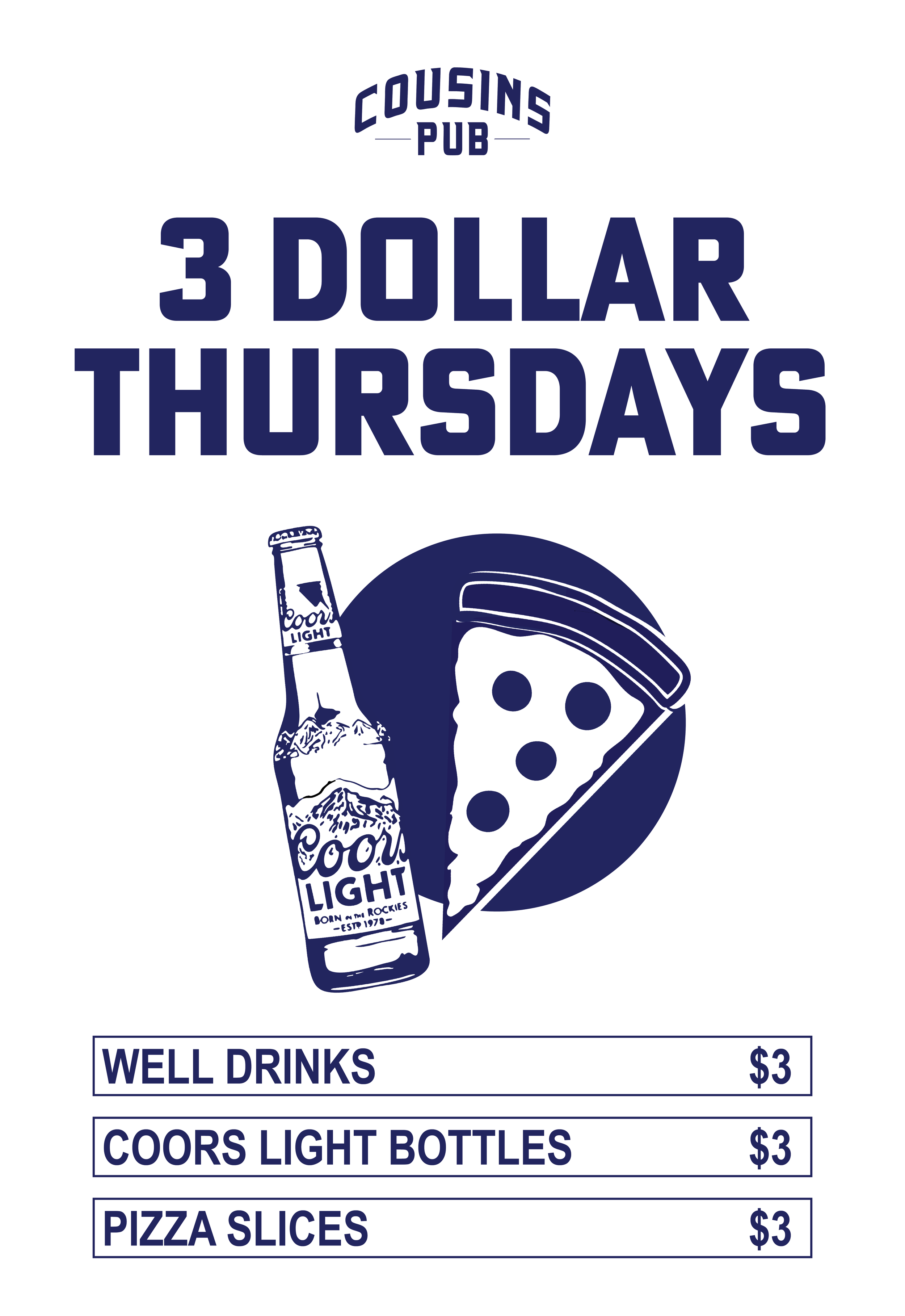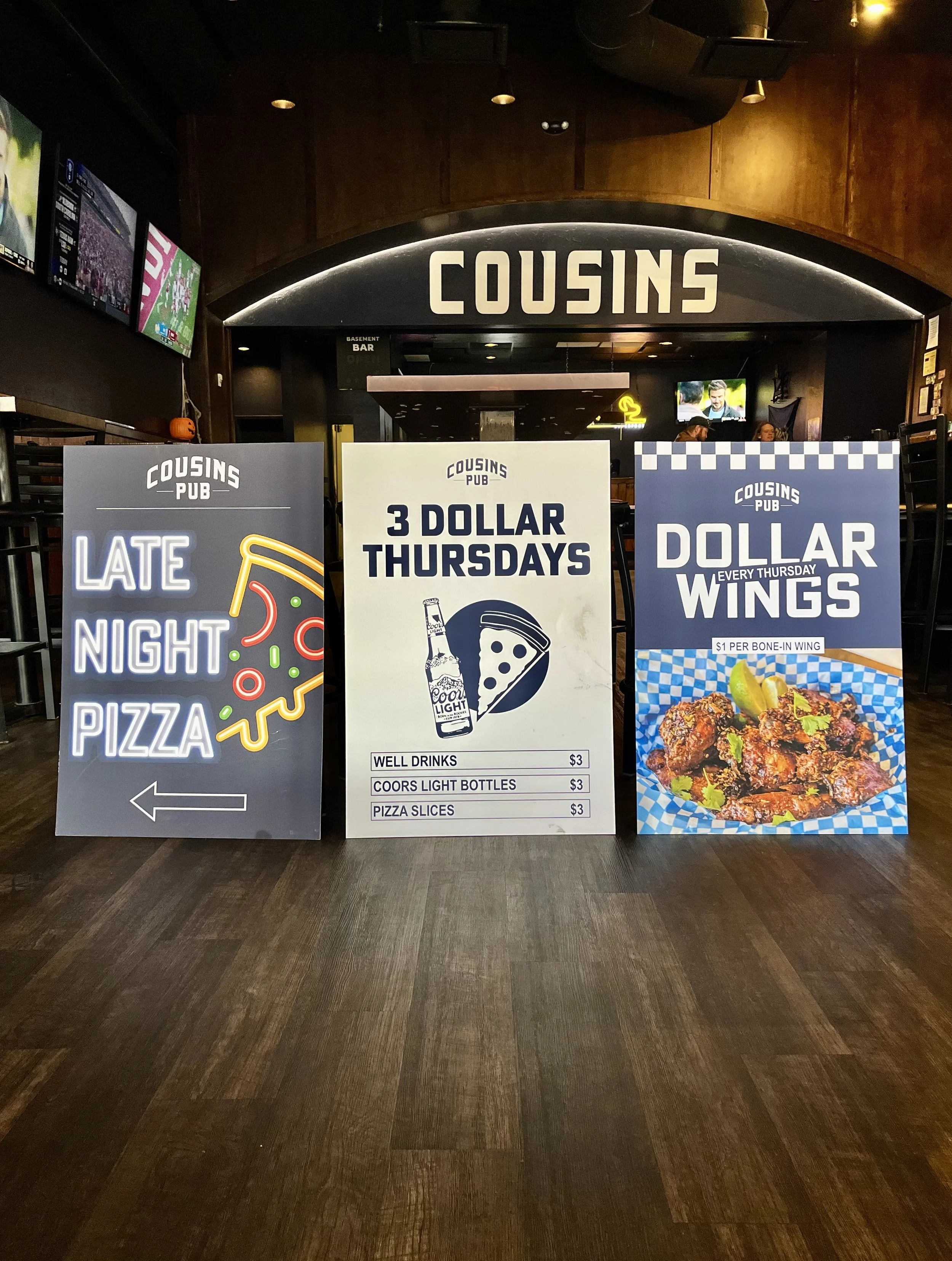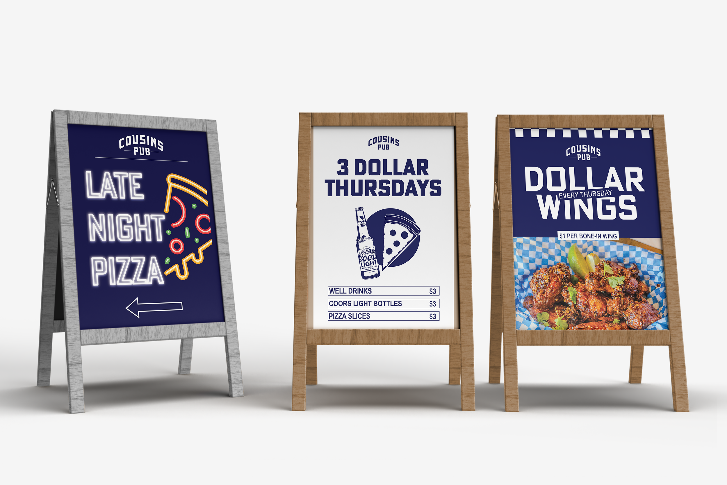 Designed consistent weekly promotional signage to increase visibility and drive recurring traffic. Each promotion (Late Night Pizza, Dollar Wings, 3 Dollar Thursdays) was developed with clear hierarchy, bold typography, and strong brand alignment to ensure quick readability in a fast-paced bar environment.