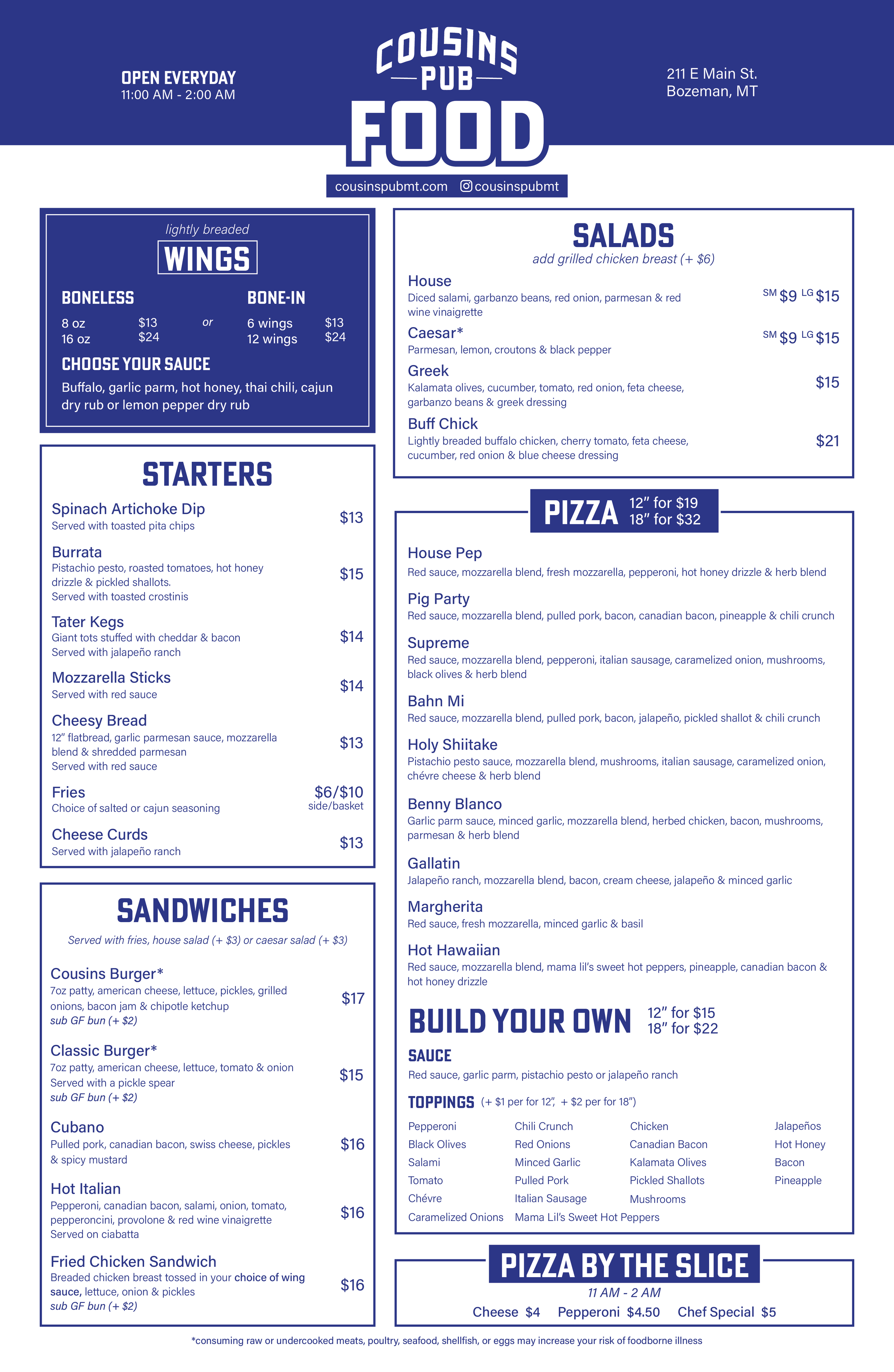 Serve as the ongoing marketing and graphic designer for Cousins Pub, a high-traffic restaurant and bar located on Main Street in Bozeman, Montana. Support brand consistency, event promotion, and in-house communication through strategic design and programming initiatives.